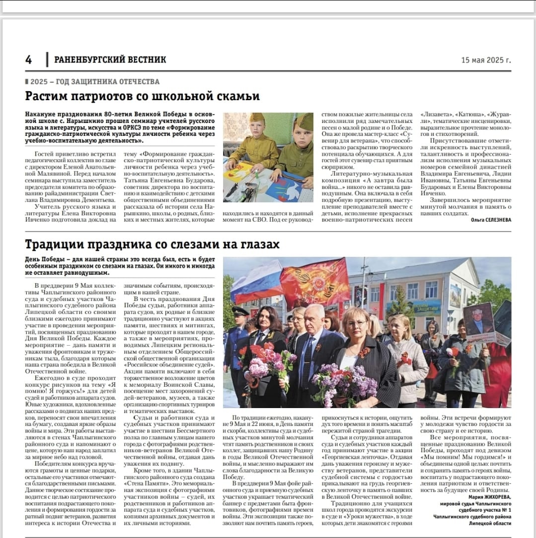 Опубликована статья мирового судьи Чаплыгинского судебного участка №1 Чаплыгинского судебного района Липецкой области Марии Жихоревой в газете «Раненбургский вестник»